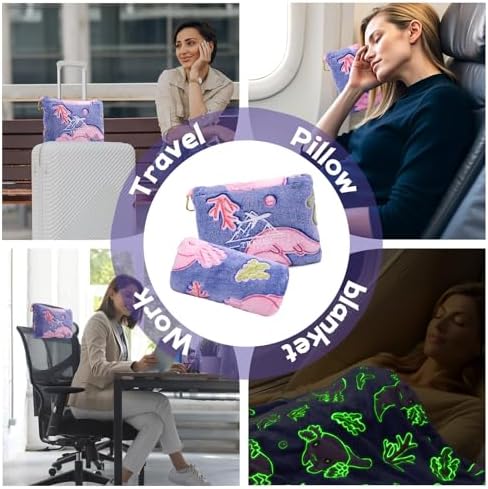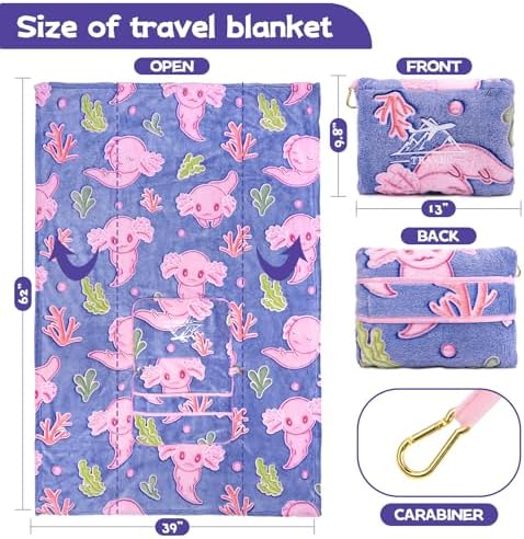 Before Unfolding: 9.8IN*13IN, compact and easy to carry, just like a small travel pillow or compact lumbar support.After Expansion: 40IN*60IN, large enough to keep you warm during travel, work, or rest, suitable as a travel blanket for airplanes or any travel occasion.Innovative Hidden Pocket: Upgrade of Storage and Convenience. The travel blanket folds into a charming axolotl-patterned pouch with a hidden pocket, featuring a convenient “travel blanket airplane compact with bag” design, serving as a great alternative to a travel pillow and blanket set for easy storage.Zipper: The smooth zipper for easy folding and unfolding.Glow in the Dark Design & Multi-Functional: The axolotl pattern with glow in the dark feature makes it stand out from other travel blankets. The cute purple axolotl pillow blanket is also a toys for kids, which adds a touch of fun to your travels. Suitable for various occasions – travel, work, rest, making it a versatile addition to your blanket collection, whether as a travel blanket for airplanes or a throw blanket at home.Comfort &Convenience: Made of soft microfleece polyester, this soft purple blanket provides a cozy and warm experience. The compact size when folded and the hidden pocket for essentials make it a practical travel companion, a travel pillow and blanket set for easy carrying.Axolotl Gifts: This glow in the dark axolotl blanket is not just a practical item but also gifts for girls or women. For girls, the travel blanket and pillow set can be a wonderful birthday gifts and toys collection. Also can as a cozy gifts for women, offering comfort and style. Can be easily washed in a washing machine, maintaining its softness and color.