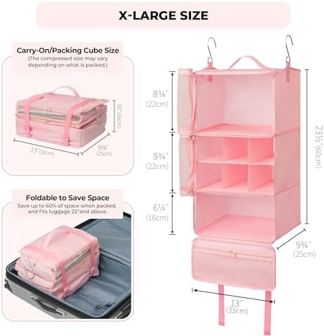 Space-Saving Compression: Unlike traditional hanging travel shelves, our hanging luggage organizer can be folded and compressed. Featuring sturdy buckles and full-wrap straps, it helps save up to 60% of space in your suitcase when compressed.